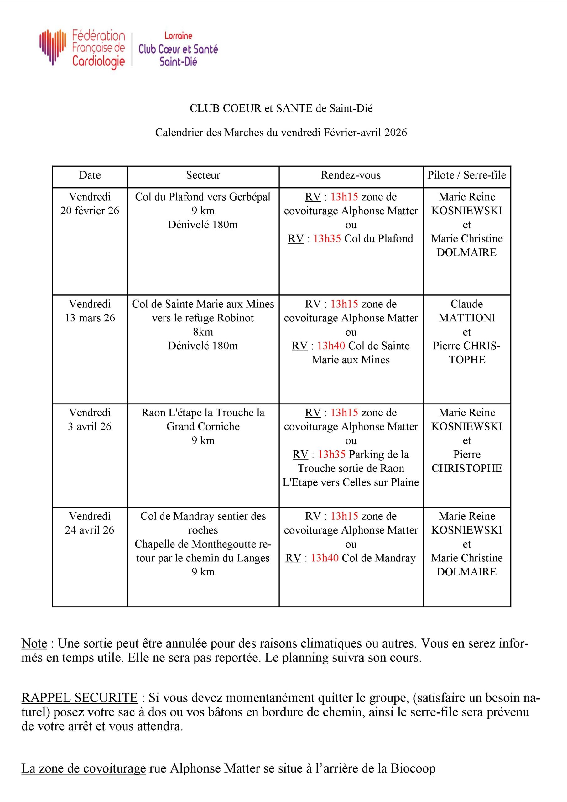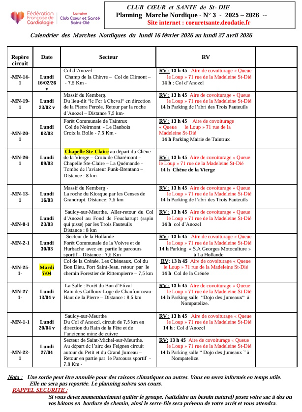Premier sortie pour 2026 : jeudi 5 mars. Pour les suivantes, RV au point de départ à 13 heures 15.