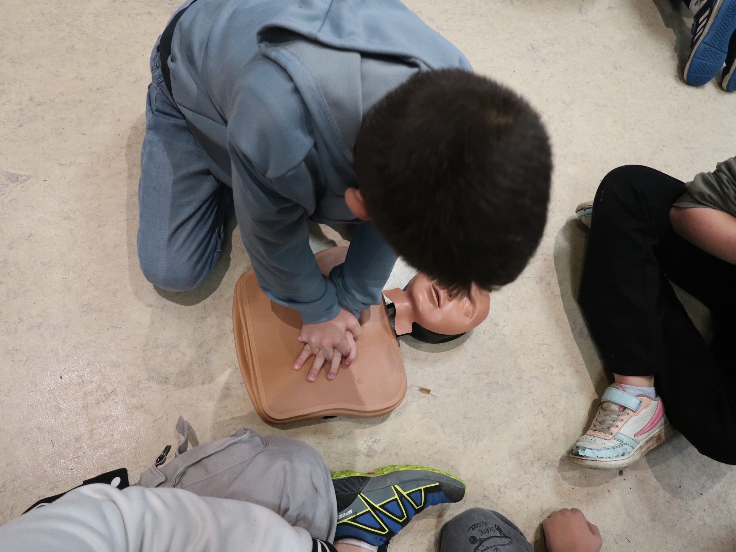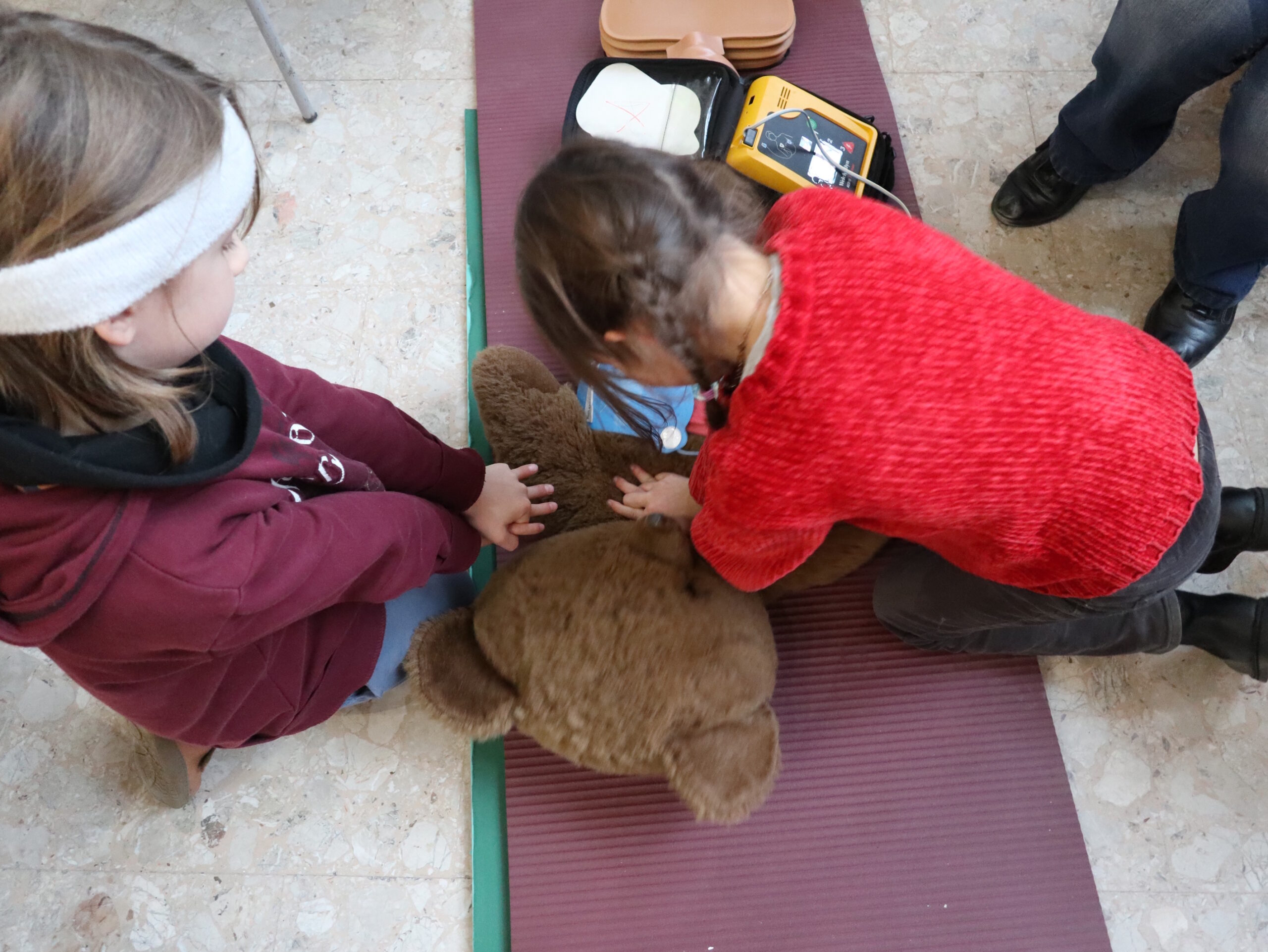 Enfants pratiquant le massage cardiaque une peluche le 25 novembre 2025