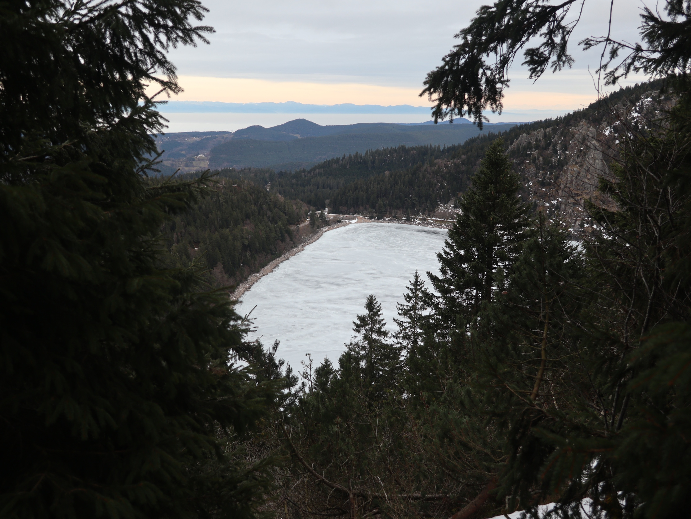 Le lac blanc gelé, la plaine d’Alsace sous la brume et la ligne bleue de la Forêt Noire