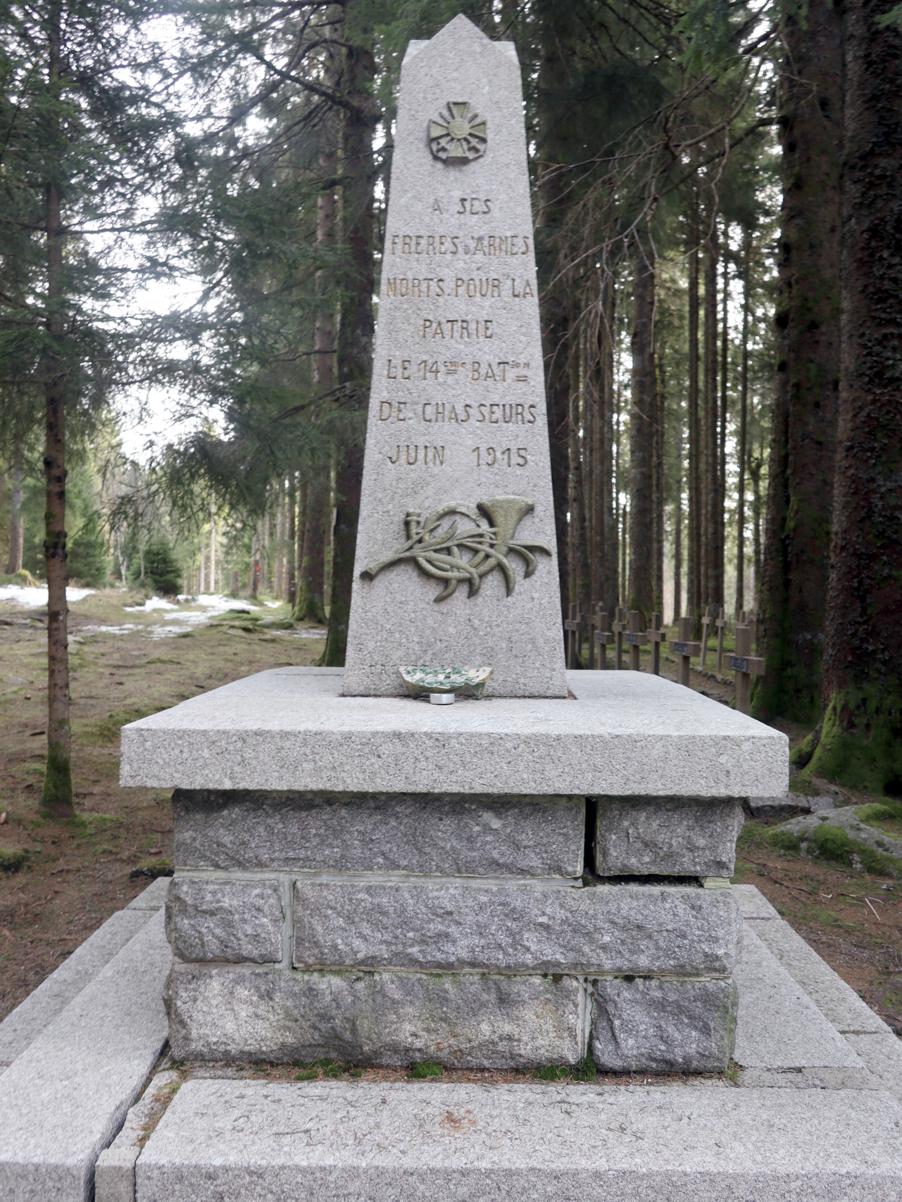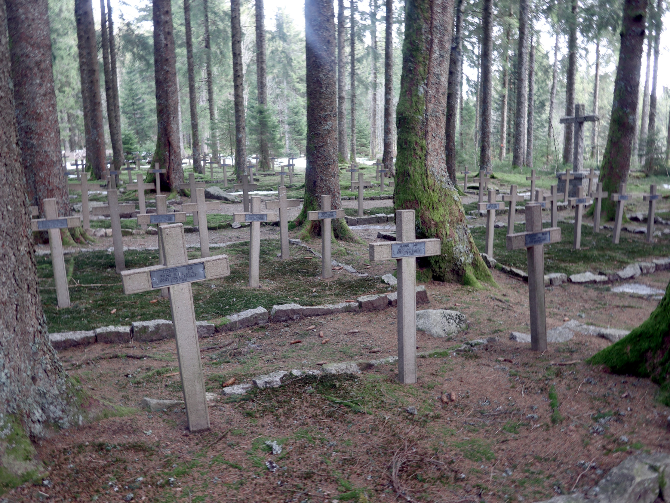 La marche du matin a emprunté un circuit passant par le carrefour du cimetière militaire Duchesne, une nécropole nationale de la Première Guerre mondiale situé au pied de la tête des Faux, à l’emplacement d’un ancien camp militaire. Elle porte le nom du commandant Duchesne, chef de bataillon du 215e RI, mort le 2 décembre 1914 à la Tête des Faux. Elle regroupe à l’ombre de la forêt les tombes de 294 soldats et un ossuaire où reposent 116 soldats décédés sur le secteur ou au Linge. Il s’agit en grande partie de chasseurs alpins.
