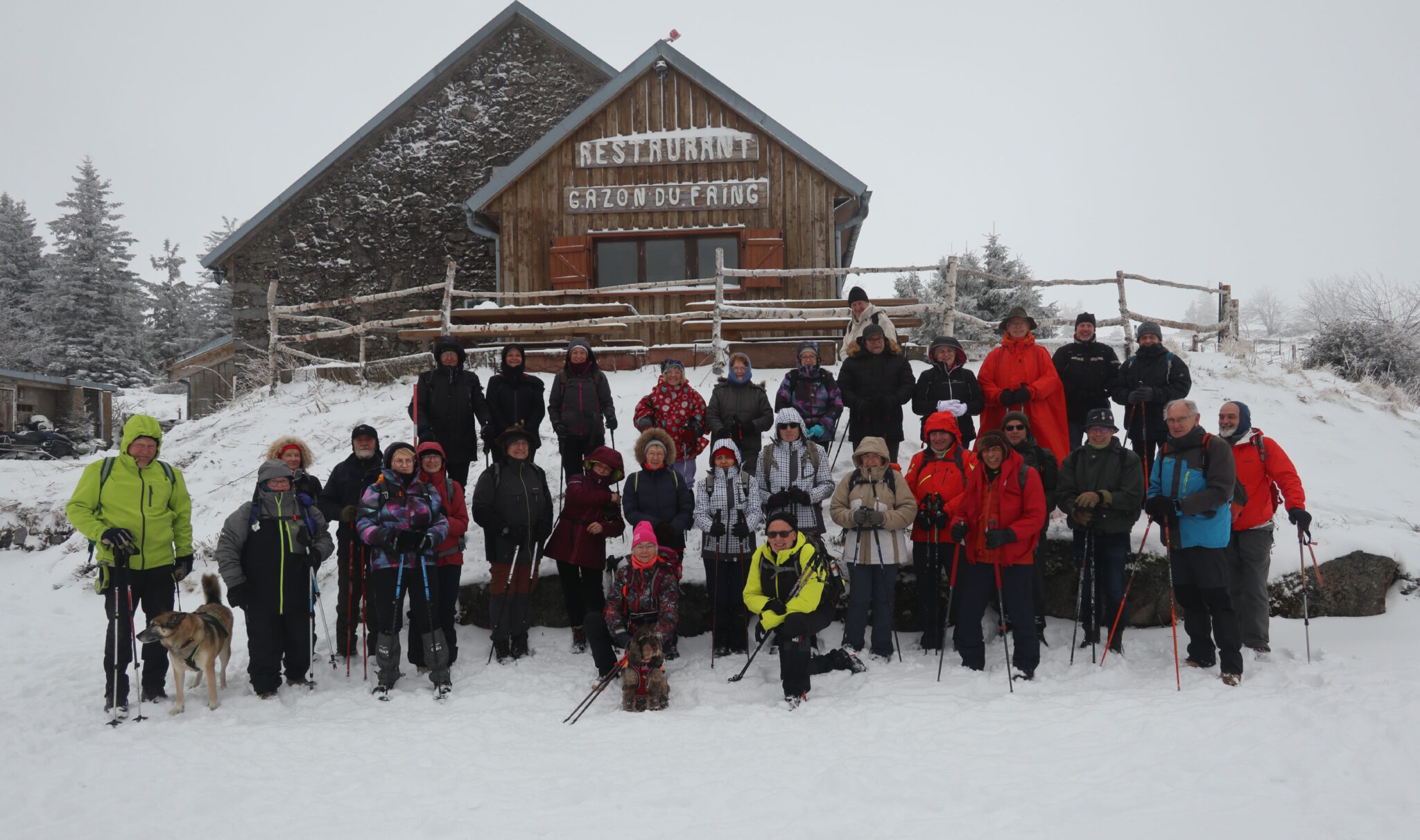 Devant l’auberge du Gazon du Faing. Sortie en raquettes sur les crêtes enneigées le 13 février 2025